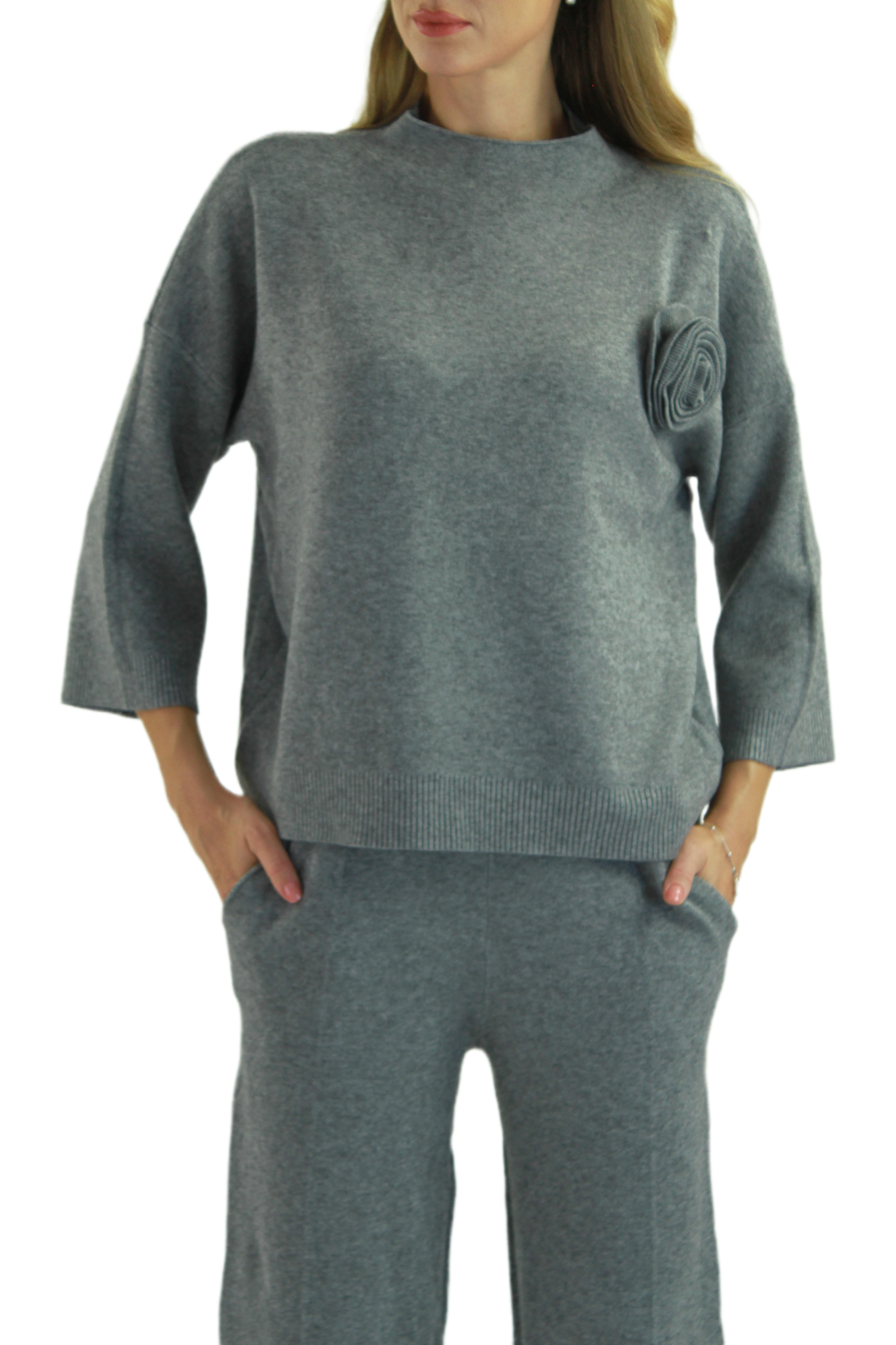 - bluza cu maneci trei sferturi si detaliu floral decorativ aplicat pe bust;